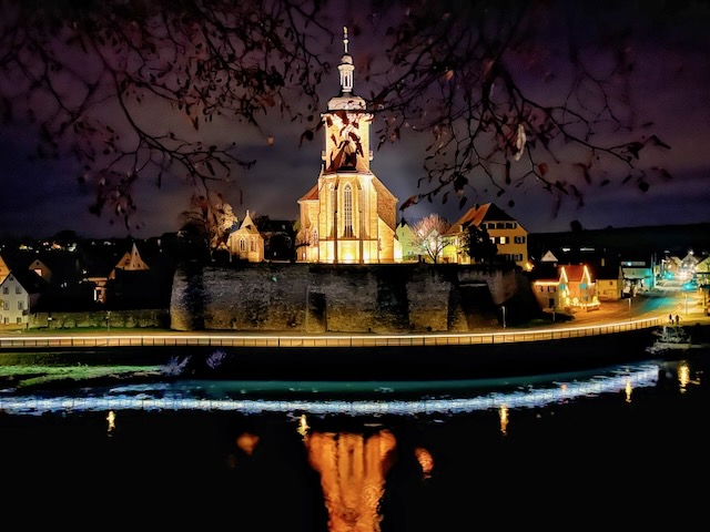 Da das Wohnmobil noch nie den Neckar gesehen hat, wurde der Ort Lauffen ausgesucht. Auch hier konnte man mal wieder einen wunderbaren Abendspaziergang genießen und die Sakralbauten im Scheinwerferlicht, sowie alte Häuser und Gassen bestaunen.