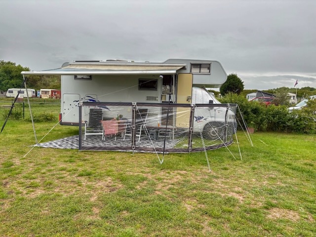 Sturmschaden Dachhaube der Dusche bei Willi. Ich habe doch glatt übersehen, dass die Haube nicht richtig arretiert war und der Wind hat die Haube förmlich rausgerissen. Zum Glück in der Hecke vier Meter weiter gefunden und mit Panzerband provisorisch verklebt.
