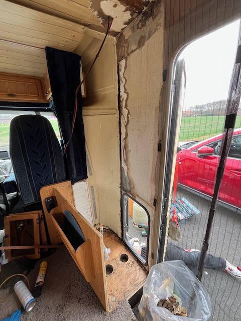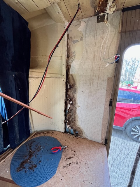 Bürsti hat ein Loch! Wasserschaden zwischen Fahrerkabine und Aufbautür. Locker 4 Meter Holzrahmen verrottet und musste ersetzt werden. Ursache: Vorbesitzer haben lackieren lassen, aber eine kleine Lederleiste wurde nicht gut abgedichtet …